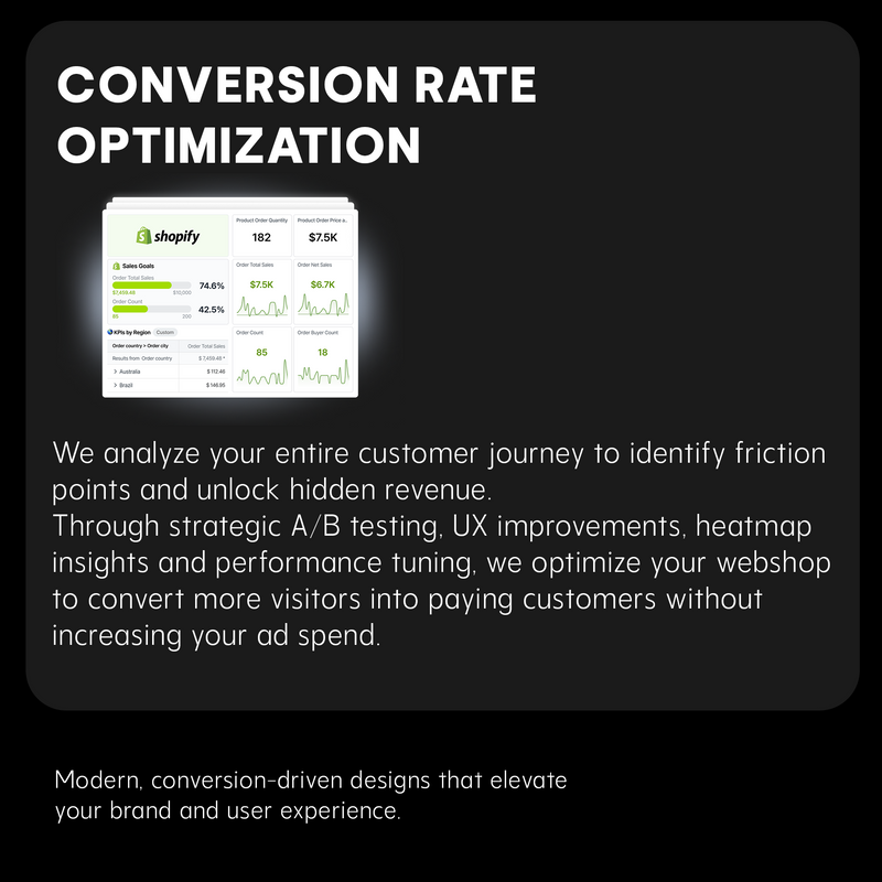 We build Shopify stores engineered for performance — blending clean visuals, smart UX, and proven CRO principles. Every section, layout, and detail is optimized to increase trust, boost engagement, and turn visitors into customers effortlessly.